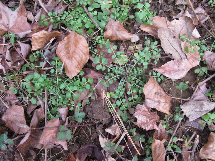 I believe this one is Cardamine hirsuta (hairy bittercress) and it is everywhere(below), lasting well into the frosty times. I planted a few of the tiny ones but since they grow so fast they my flower before the show and then die.