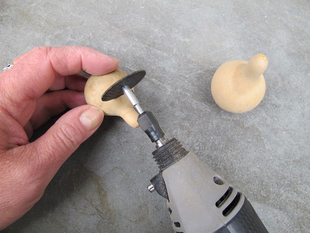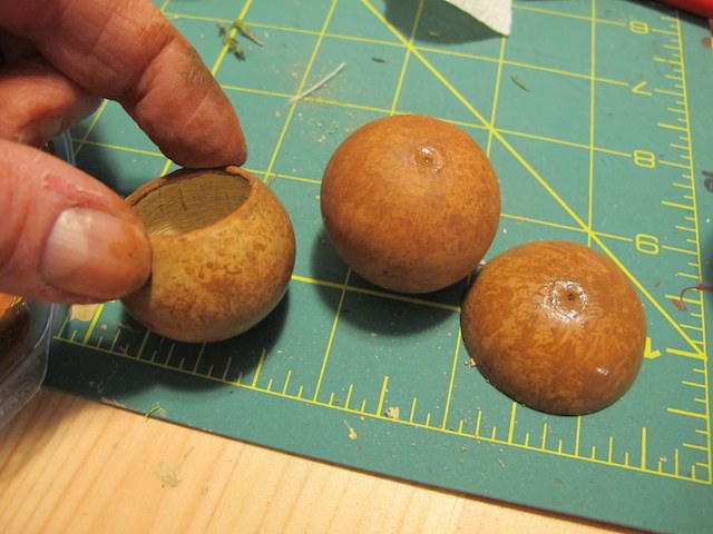 The most fun was working with miniature gourds (called Tennessee Spinner Gourds: Cucurbita pepo); you can buy them online, including at Local Harvest). They are a bit expensive so I also bought some seeds to grow my own next year. I cut them open with a Dremel drill and it created a nice burnt edge. I painted them with several different colors that I wiped off immediately to give a stained look and then waxed them (using Museum Wax) to give a realistic surface (which on a real gourd would probably be burnished). Several of the water bottle shapes are tied with cords that are used to carry or hang them. The cords are embroidery thread dyed with black tea and then stained with paint.