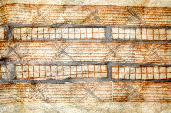 I made some miniature kapa sheets (called tapa in other parts of the Pacific). I used thin sheets of mulberry paper kindly ordered for me by the Merion Art and Repro Center in Ardmore. Real kapa is made from the mulberry plant too. I painted and stamped it, using some traditional Hawaiian motifs but not directly copying any one piece. These sheets are about 3 inches wide. I dyed the sheets (which were white) with black tea.