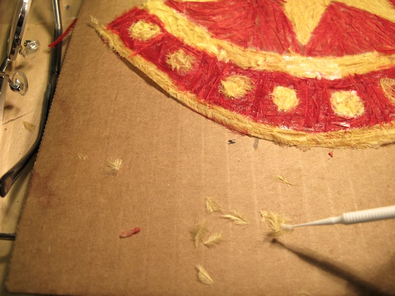 Finally, it was back to the feather cloak which still has only a thin layer of feathers. I started adding tiny feathers for the next layer using “Mod Podge” (instead of glue) this time. A much better approach.
