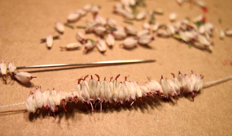 As if I had nothing else to do, I decided to see if I could make a miniature lei with real flowers. I found some white heather (ERICA DARLEYENSIS ‘MEDITERRANEAN WHITE’) blooming in my garden, took a few stems with flowers, and sewed them onto a thread. It worked. I am hoping to be able to buy a real life-size lei to wear during the flower show.