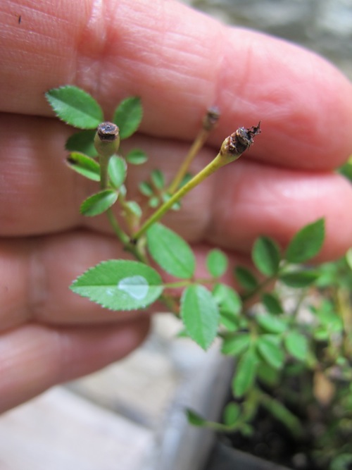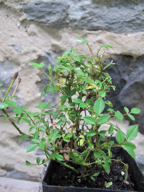 I promised myself that I would not start next year’s miniature garden until I cleaned up my workspace and greenhouse and outdoor garden and office…and I swore I would not buy any miniatures plants until next year. But I had a nice interview with a reporter who was doing a story on miniature gardening and it for me thinking. What is the one plant I would love to have, in miniature, that would be amazing in my display next year? It is a miniature rose and I have heard about them but never seen one. Well. I found them at Rogue Valley Roses. They are called “Si” and I ordered two. They don’t look like much now: