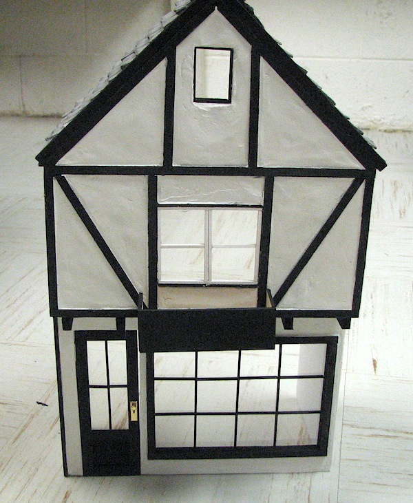 Adjacent to the Cotswold cottage is our tea room. We’re still struggling with a name for this shop. It’s a fairly straightforward construction using gator foam for the walls. We wanted this structure and the pub that will be next to it to be what is often referred to as “Tudor style” with exposed timbers forming panels around the building. During the Victorian era the timbers were painted black and thus today these buildings are most often referred to as black and whites. I simply used varying sizes of strip wood to form the timbers and glued them directly to the gator foam. Before I even glued them down I painted them with black paint which saves one from doing a lot of detailed painting later on where one wants to avoid getting black paint anywhere else on the wall. Once I had the timbers glued down, I spread joint compound in all the areas enclosed by the timbers. One could use paperclay for this as well; I just happened to like the look I got with the joint compound. Once the joint compound is dry any serious defects can simply be sanded to smooth the wall surface. All the window frames and the door were made from strip wood. Perhaps not so obvious in the picture is a window box below the second floor window. This will be a nice place to showcase some plants.