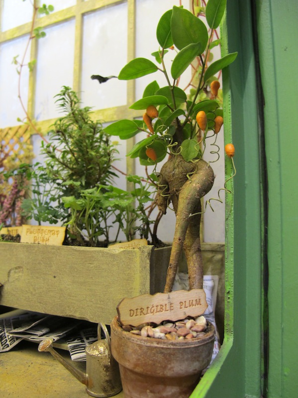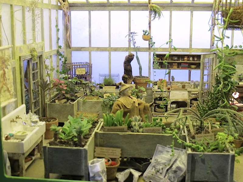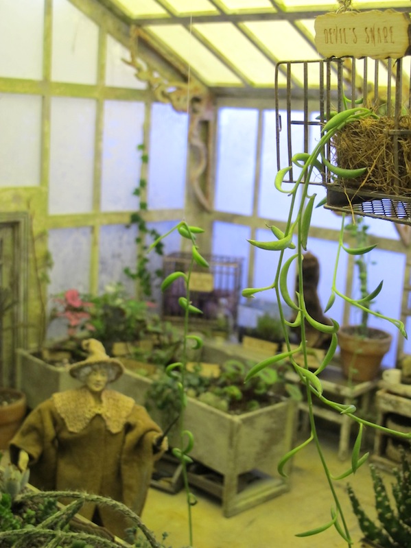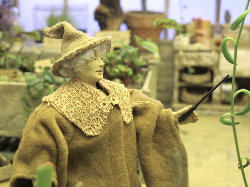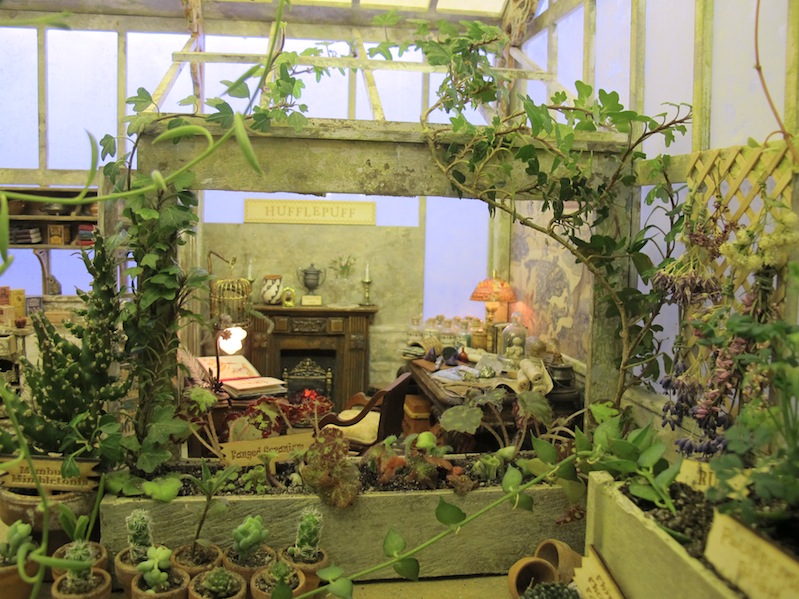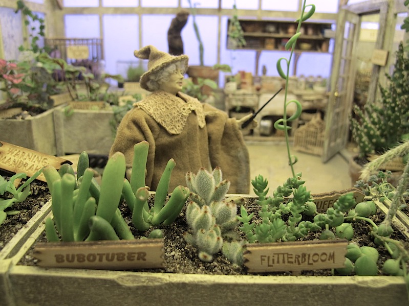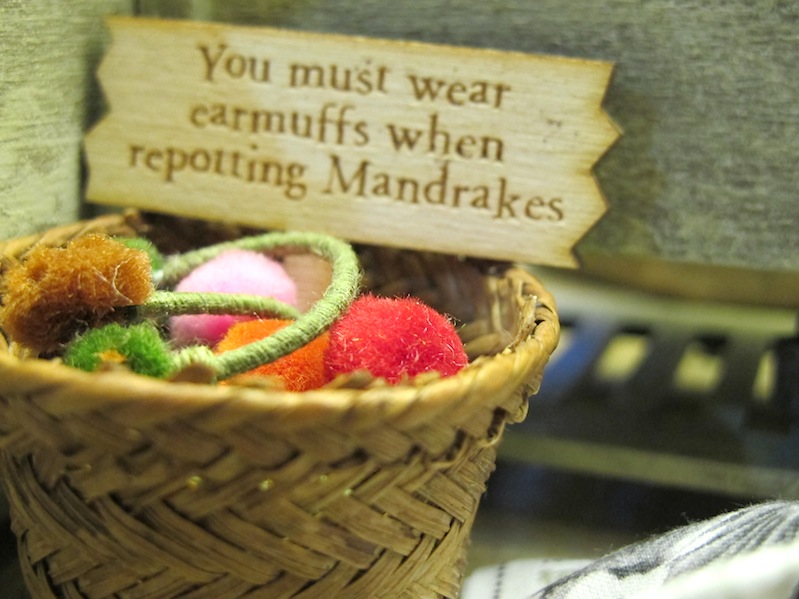 The real-life glasses on the floor give you the scale.The scenes are framed by this window which is 12in x 22inA general view of the right side of the scene.A general view of the center and left side of the sceneGeneral view looking in from the leftThe view looking into Sprout’s office. I’m glad I took the glass out because you can see everything better.Bouncing bulbs, Gillyweed, Wolfsbane, and a dangerous Snargaluff.The Devil’s Snare is escaping!The Slytherins spilled the dragon dung that they put on all the dangerous plants.Wear your earmuffs but try to avoid the pink ones!Spare toolThe beautiful Professor Pomona Sprout. I know she is supposed to be “a squat little witch” according to J.K. Rowling, but I like her like this, too.Flutterby Bush, Chinese Chomping Cabbage, and real Rue and real Nettles.The baby Mandrakes are escaping!Baby Mandrakes and posterMandrake posterBags of dragon dungA very dirty sink, with tiny ferns growing in the jars.The Dirigible Plum is trying to break out of the frame.Center view of the beds with Bubotuber (there is some Bubotuber Pus in some jars at the back) and Flitterbloom.