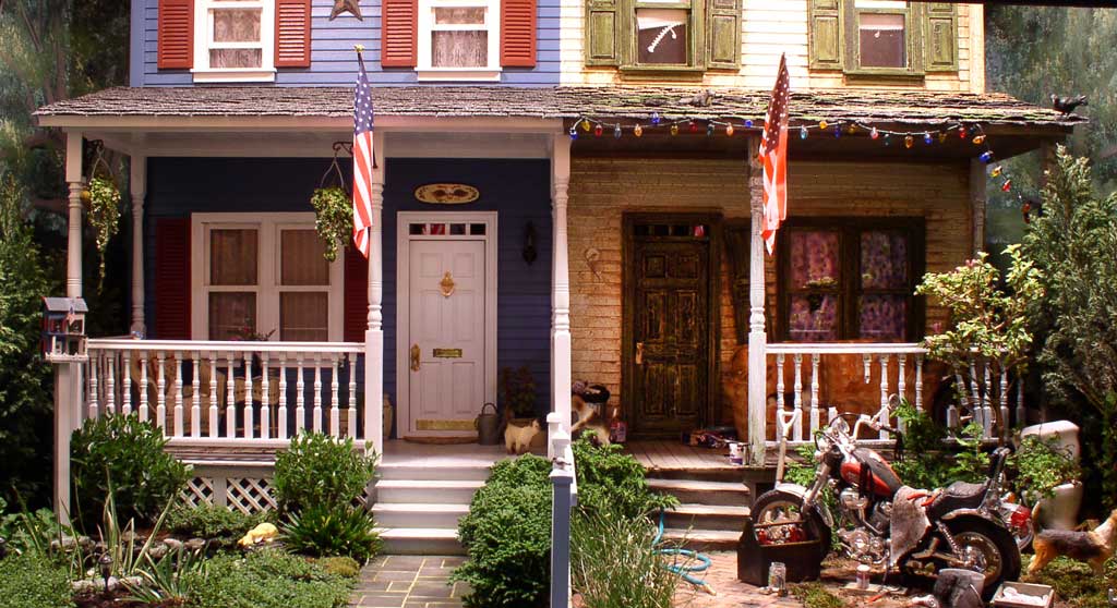 A well-constructed intent can be seen in a work from an earlier show. In their First Place and Best in Show exhibit from 2005, Deb Mackie and Nancy Grube created a perfect scene called, “Love Thy Neighbor” (today, when we talk about this exhibit, for some reason we all call it The Neighbors).