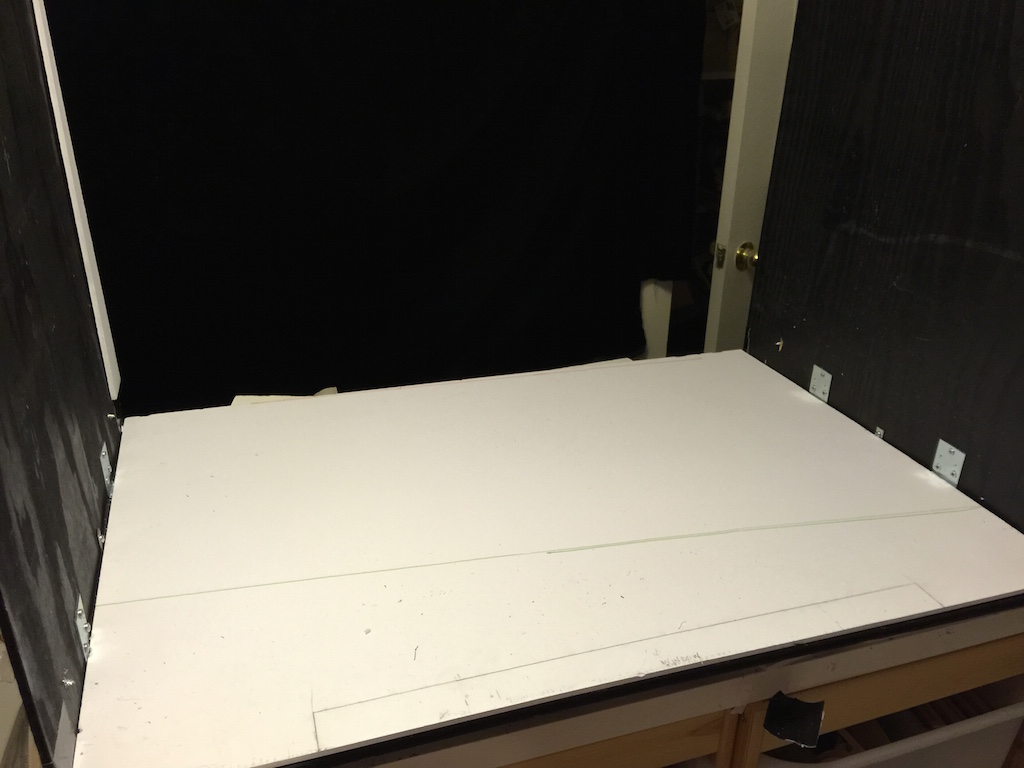 The first layer is 3/16″ white gatorfoam board. Gatorfoam does not warp and can be cut easily and cleanly, with sharp lines. It is a bit stiffer than foamcore board and quite a bit more expensive. Towards the front of the board you can see a sketch of where the viewing window opening is.