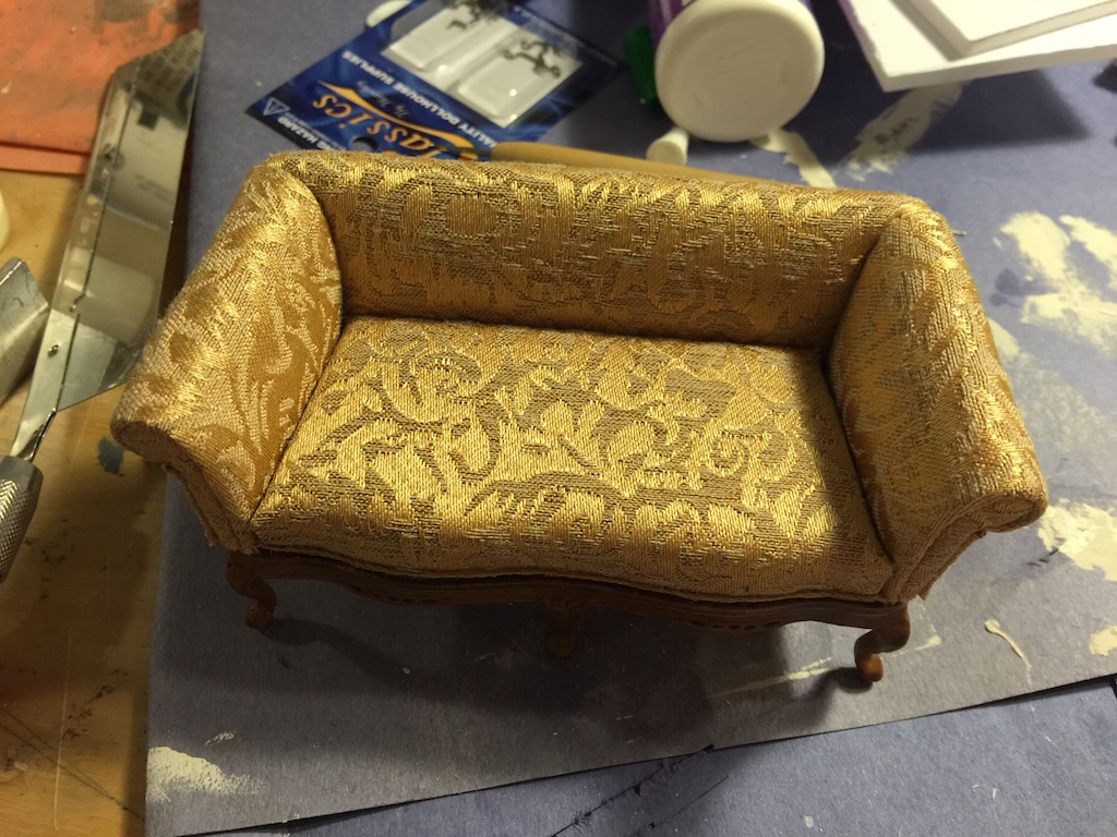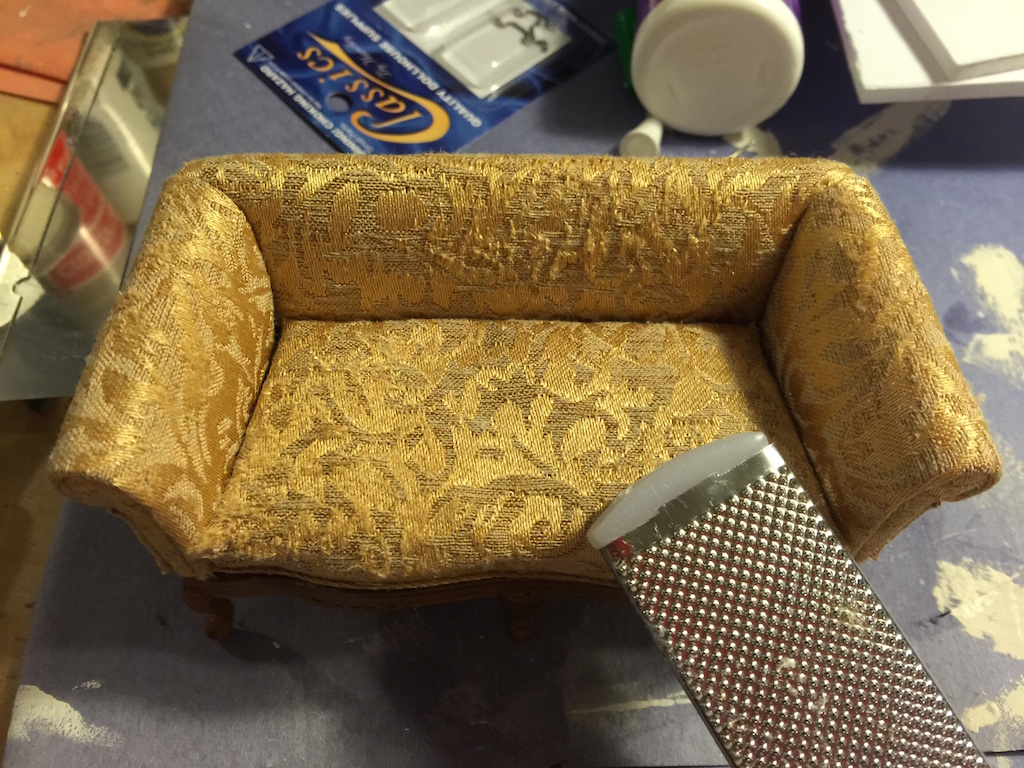 There are few miniatures that you can use without adding some wear and tear and aging. They just look too fake. Here you can see a perfect couch for Miss Lonelyhearts’ apartment but it is too new and neat. So I scratched it up and made wear patterns with a rasp and used Dollar Store eye shadow (which I would never put on my eyes!) to give it a lived-in look.