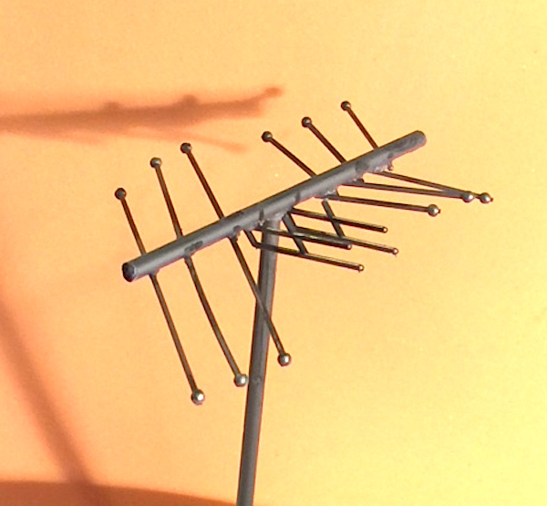 So I made one from some plastic piping that I found at a train show. It is not the right scale for pipes in a 1/12th scale scene but it was perfect for the pole and arms of the antenna.