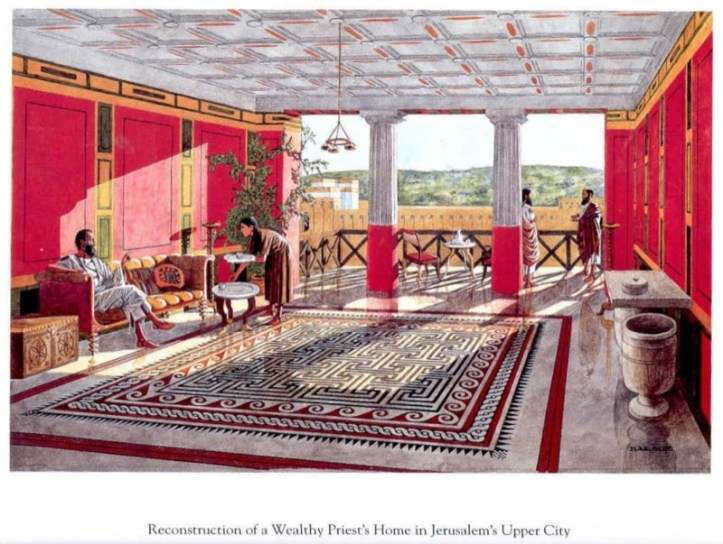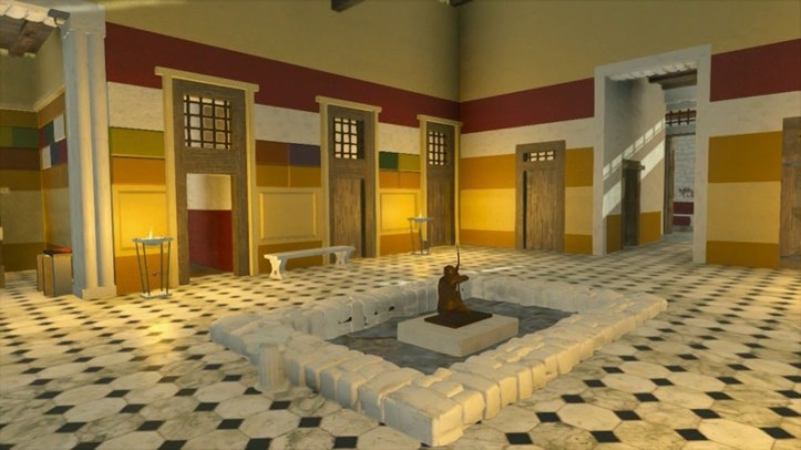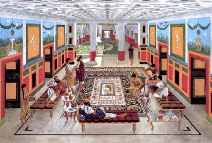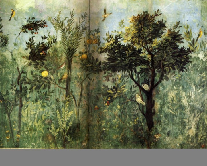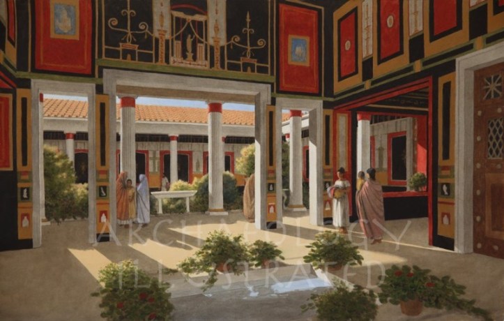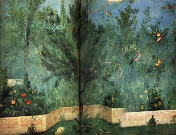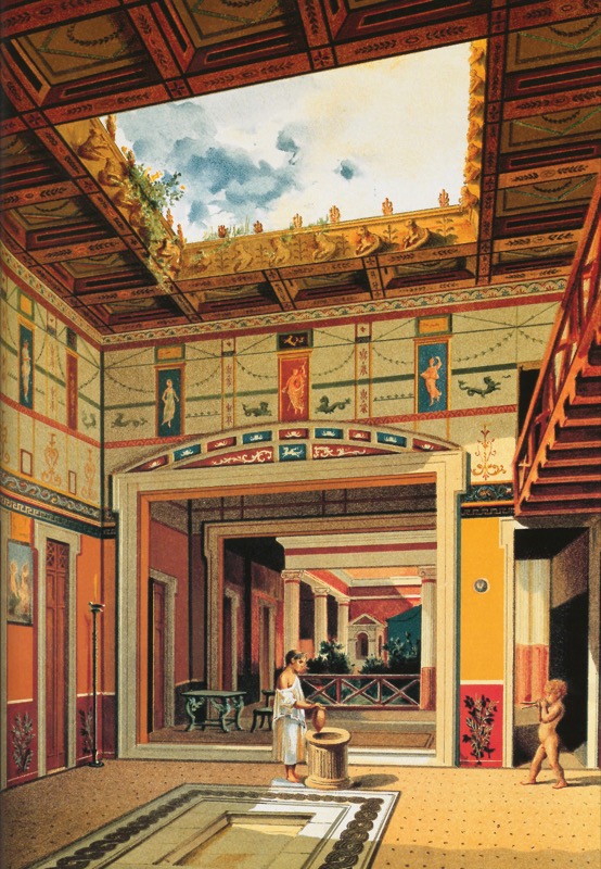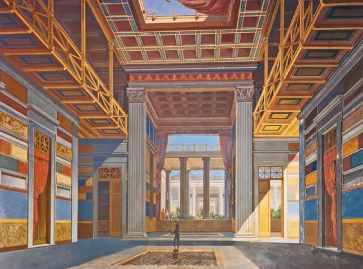 First the visual inspirations. The scene will be an interior looking out at a courtyard, a typical Roman design. Plants will be both inside and out. The wall are painted with elaborate murals in bright colors. Here are some examples.